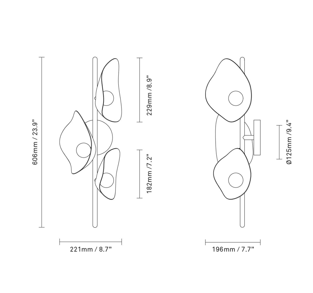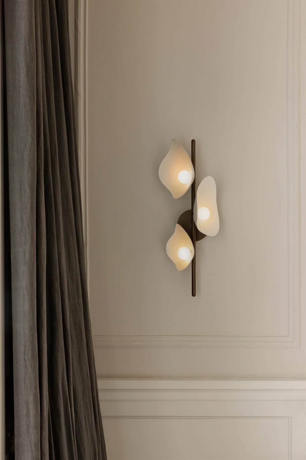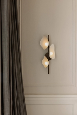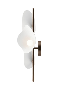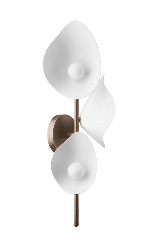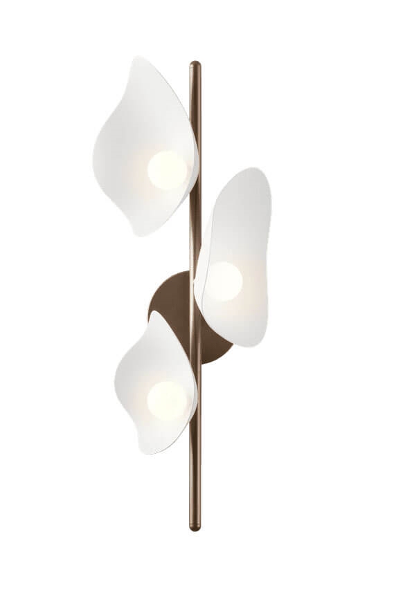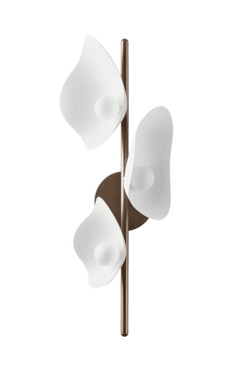 Projekt Florii 3 jest inspirowany spacerem przez las w jasny jesienny dzień, kiedy światło słoneczne tańczyło przez opadające liście. Rezultatem jest wyjątkowy kinkiet z piękną grą światła i cienia z trzech kloszy w kształcie płatków. Elegancki kinkiet z podstawą z metalu pokrytego ciemnym brązem i kloszami z opalowego szkła będzie pasował do wielu nowoczesnych wnętrz.