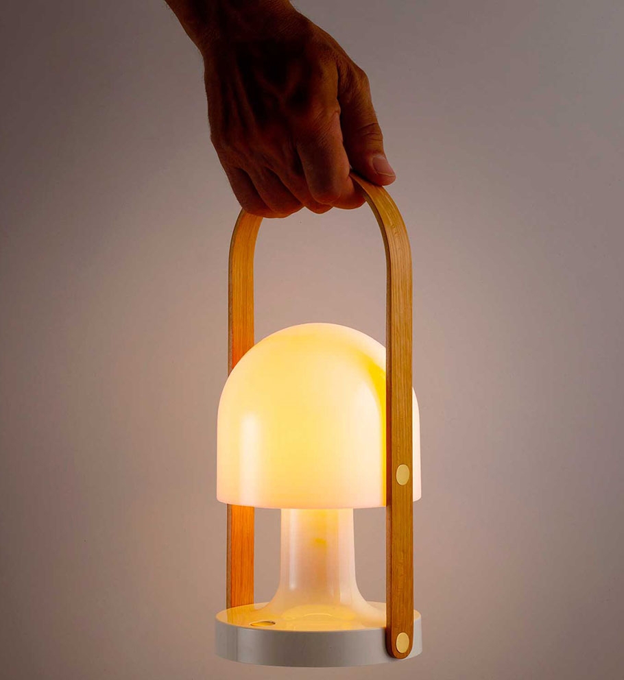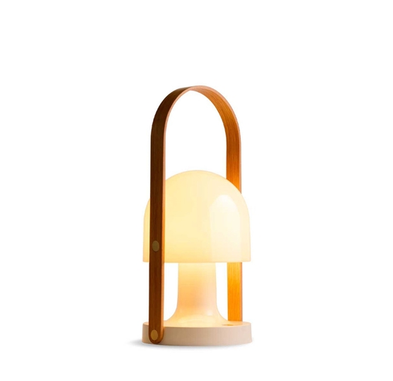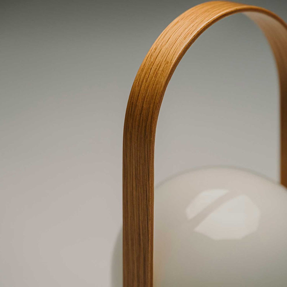 łyszczącego opalowego poliwęglanu i uchwytem z forniru z naturalnym lakierem dębowym. Materiały doskonale się uzupełniają i przyczyniają się do stworzenia charyzmatycznego, lekkiego i kompaktowego designu lampy.