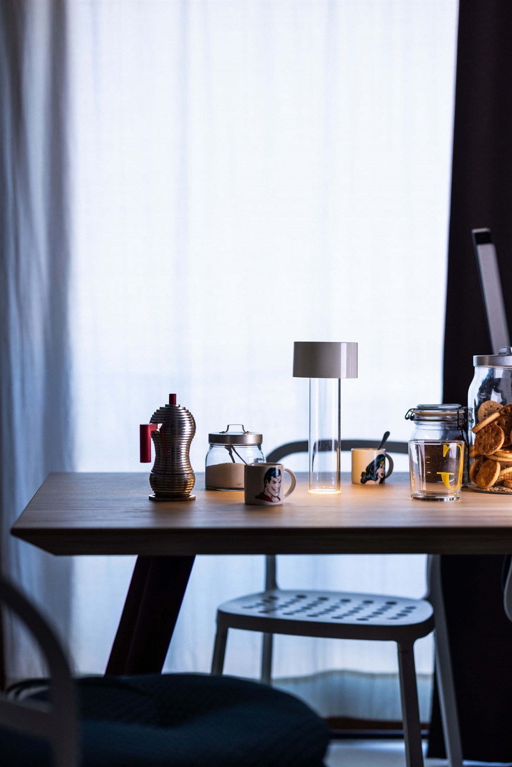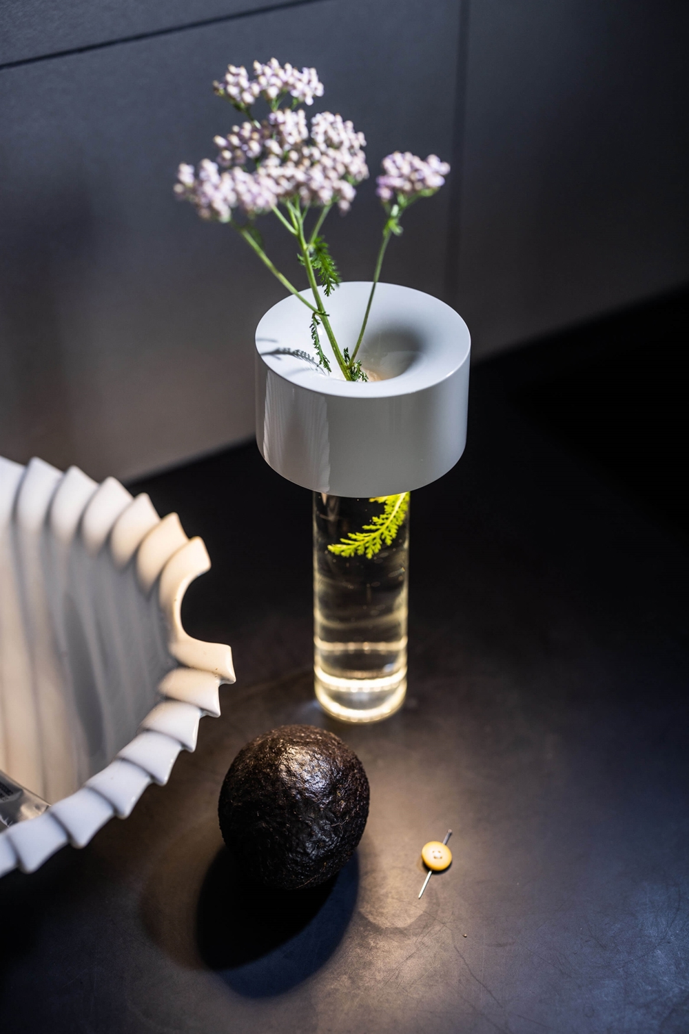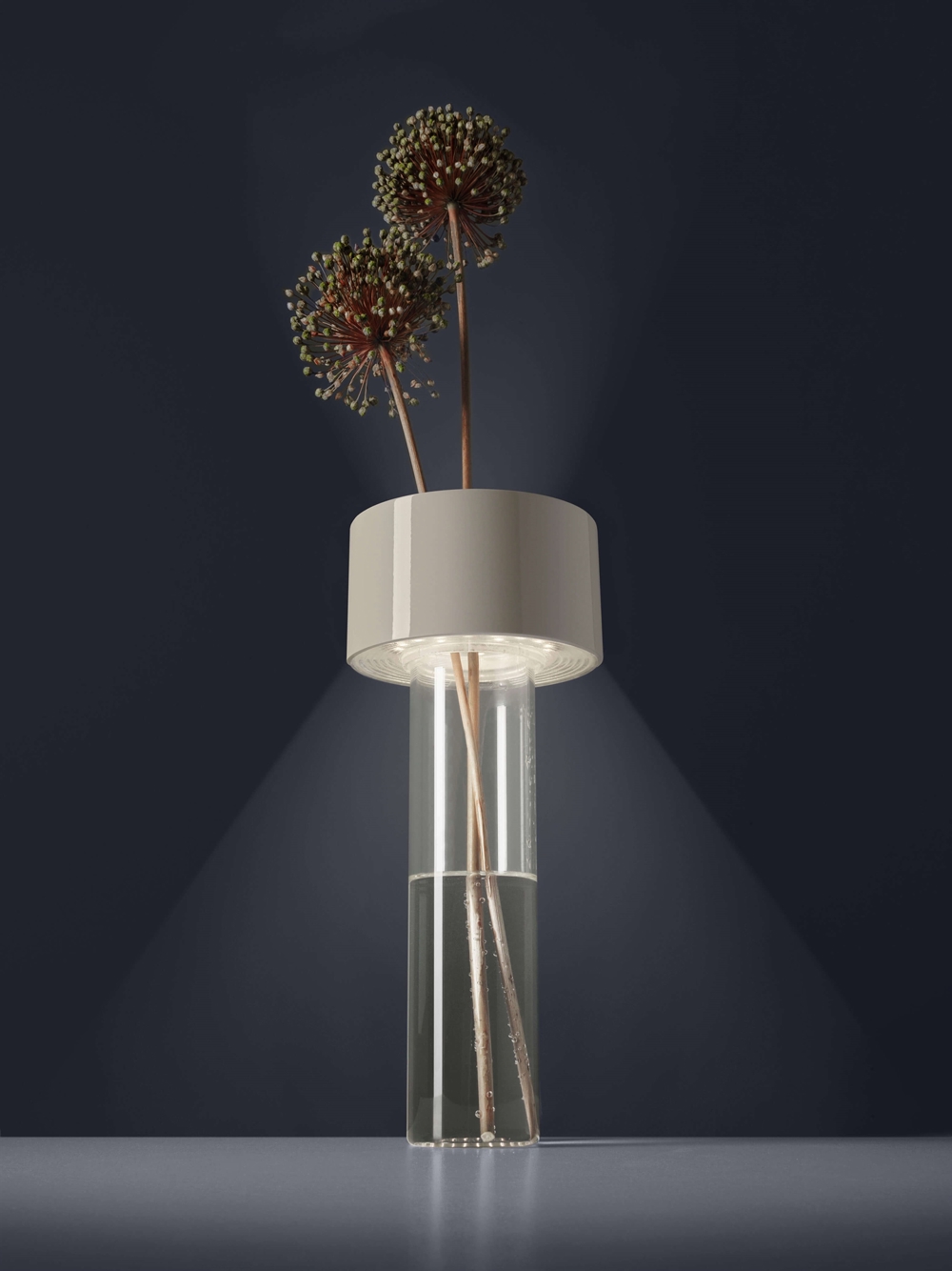 Lampa bateryjna Fleur to ładowana lampa stołowa, która emituje światło skierowane w dół i oprócz oświetlenia nastrojowego może być używana jako wazon, który można napełnić wodą. Lampa składa się z cylindrycznej podstawy ze szkła i jednokolorowej góry z źródłem światła LED i jest ściemniana w trzech stopniach. Może świecić 7 godzin na 100 procent, 9 godzin na 70 procent i 13 godzin na 30 procent.