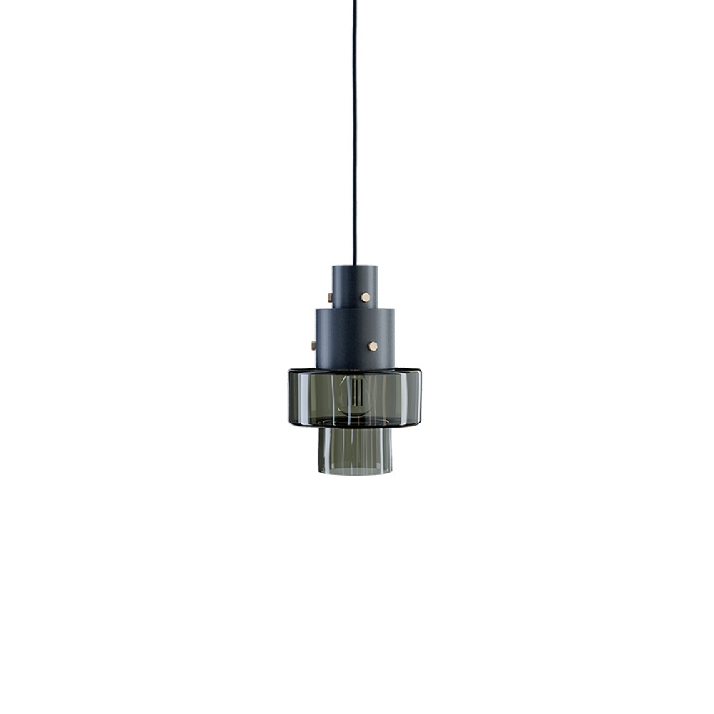 Lampa została stworzona w surowym stylu z wyraźnymi kontrastami – czarna stal, mosiężne śruby i szkło, które ukazuje źródło światła poniżej.