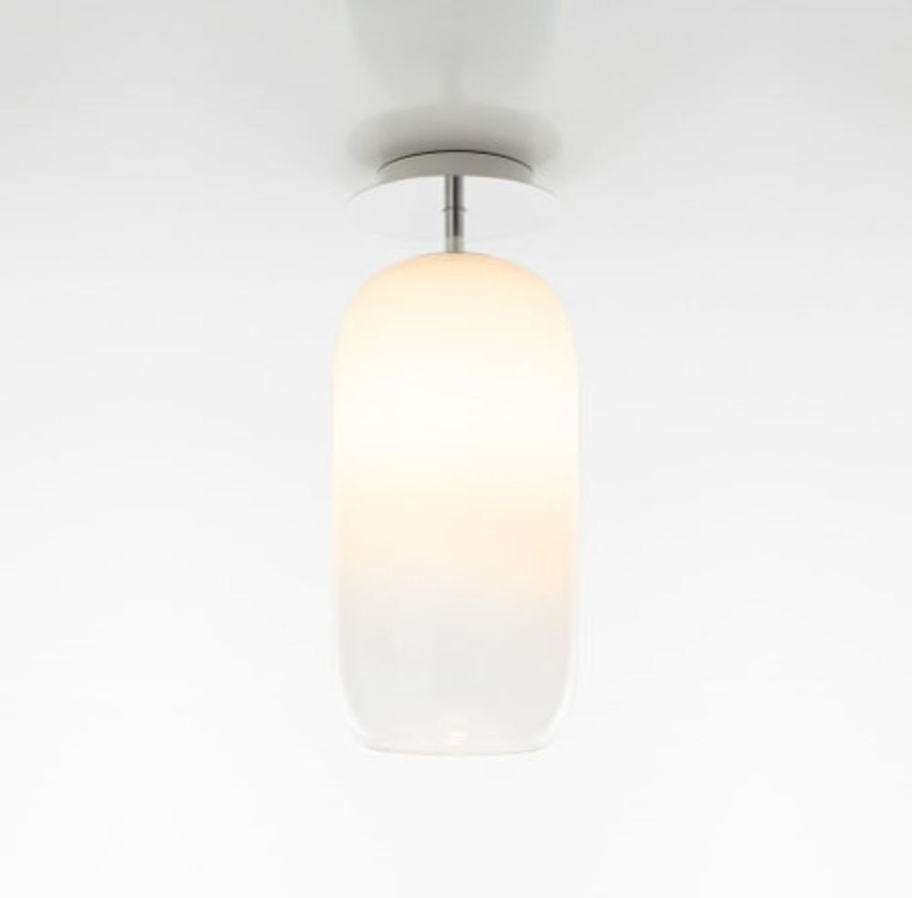 Podstawowy kształt lampy Gople podkreśla piękno szkła, które jest ręcznie wykonane zgodnie z starą wenecką techniką. Tutaj białe szkło przekształca się w szkło kryształowe poprzez połączenie obu podczas dmuchania - dzięki czemu każde szkło jest unikalne.