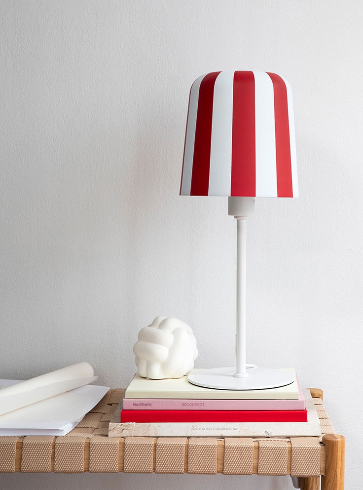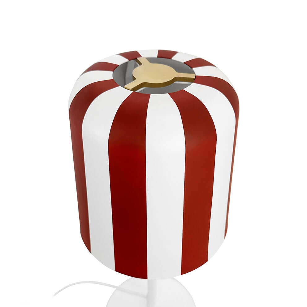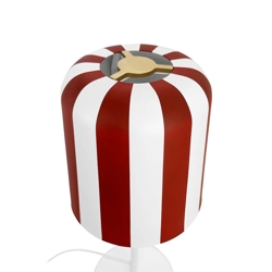 Gry lampa stołowa to duński design wykonany z białego metalu z kolorowymi paskami i mosiężnym detalem na górze. Projekt inspirowany jest między innymi kolorowymi karuzelami, diabelskimi młynami, balonami na gorące powietrze i lizakami, z zamiarem stworzenia radosnej lampy, która wywoła uśmiech na twarzy.