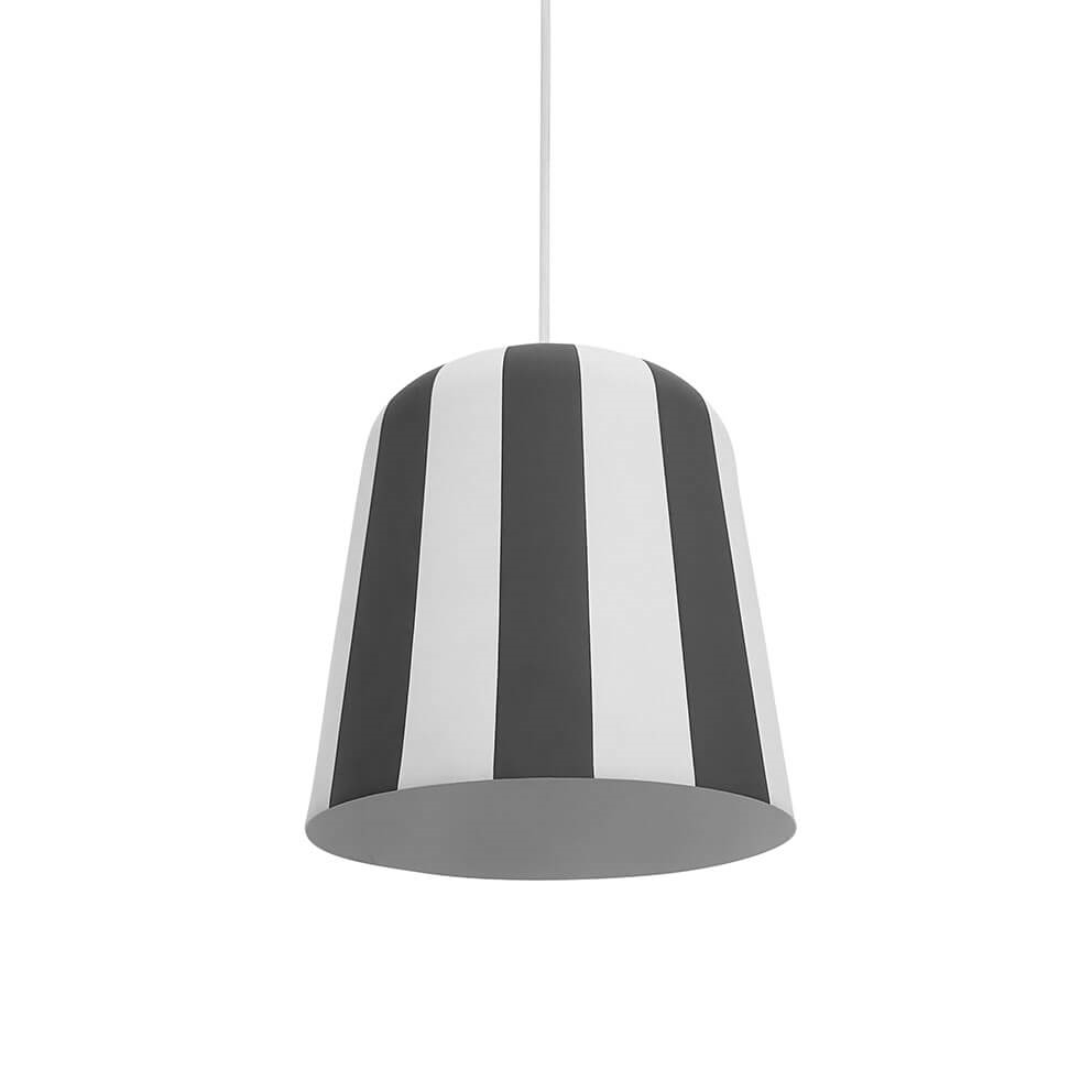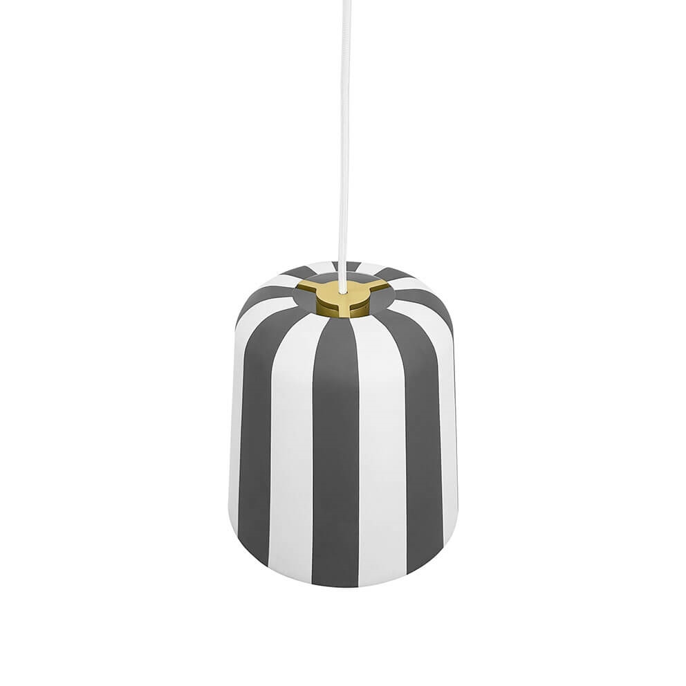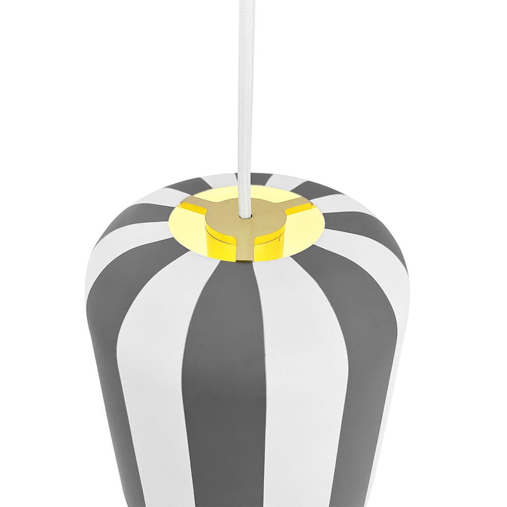 Gry lampa wisząca to duński projekt wykonany z białego metalu z kolorowymi paskami i detalem z mosiądzu na górze. Projekt inspirowany jest kolorowymi karuzelami, diabelskimi młynami, balonami na gorące powietrze i lizakami, z zamiarem stworzenia radosnej lampy, która wywoła uśmiech na twarzy.