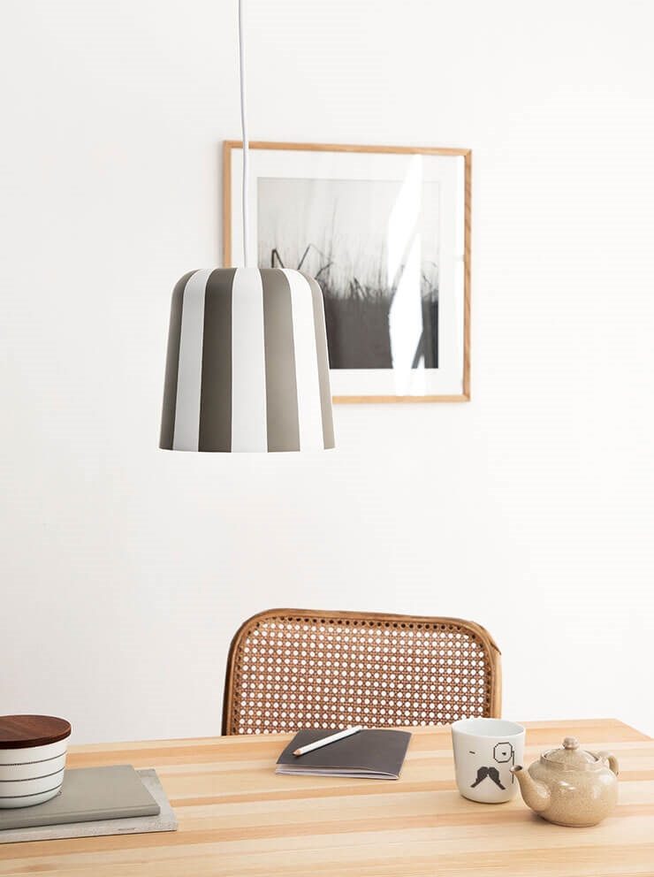 Gry lampa wisząca dostępna jest w białym kolorze z paskami w kolorze czerwonym, żółtym lub szarym oraz jako lampa stołowa w tych samych kolorach.