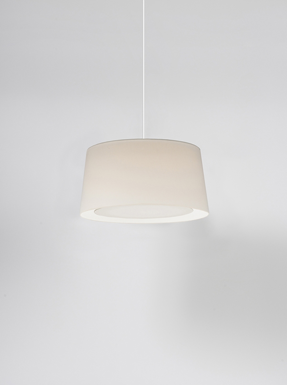 Santa & Cole GT6 lampa wisząca, biały klosz z białym przewodem i białą podsufitką.