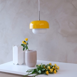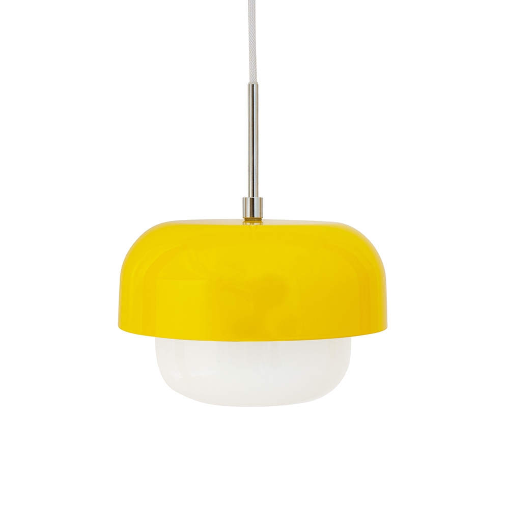 Piękny żółty kolor i design lampy są inspirowane japońskim światem kolorów i pięknymi kolorami Australii. Lampa ma elegancki metalowy top z pasującą podsufitką oraz klosz wykonany z dmuchanego opalowego szkła, który zapewnia piękne rozproszenie światła.