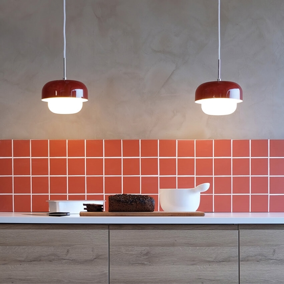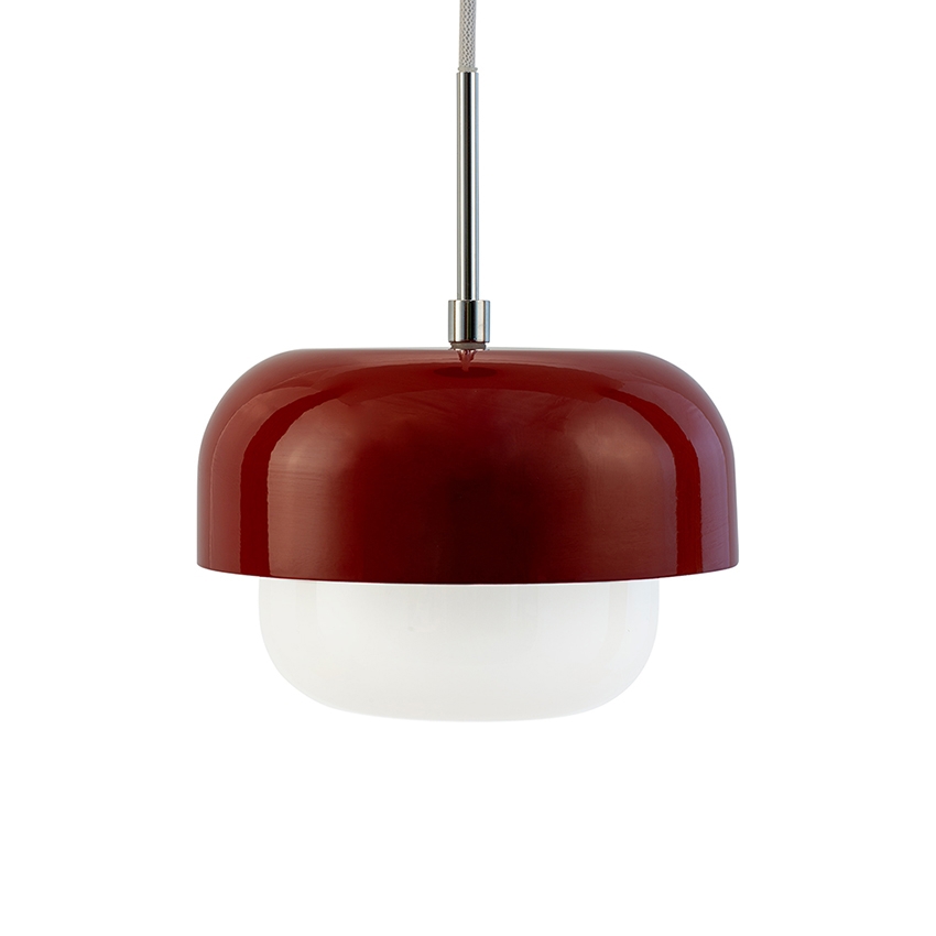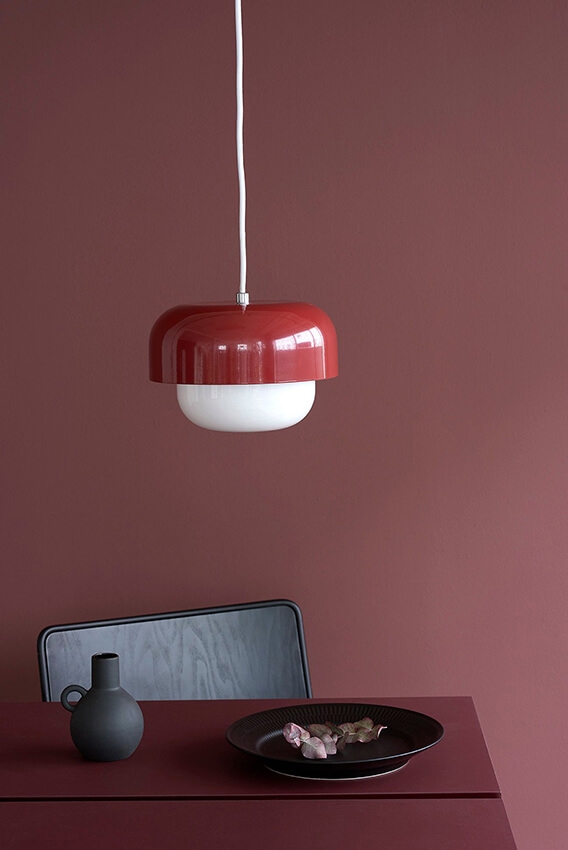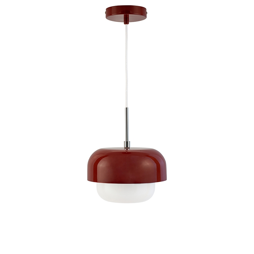 Piękny czerwony kolor i design lampy są inspirowane japońskim światem kolorów i pięknymi kolorami Australii. Lampa ma elegancki metalowy top z pasującą rozetą oraz klosz wykonany z dmuchanego opalowego szkła, który zapewnia piękne rozproszenie światła.