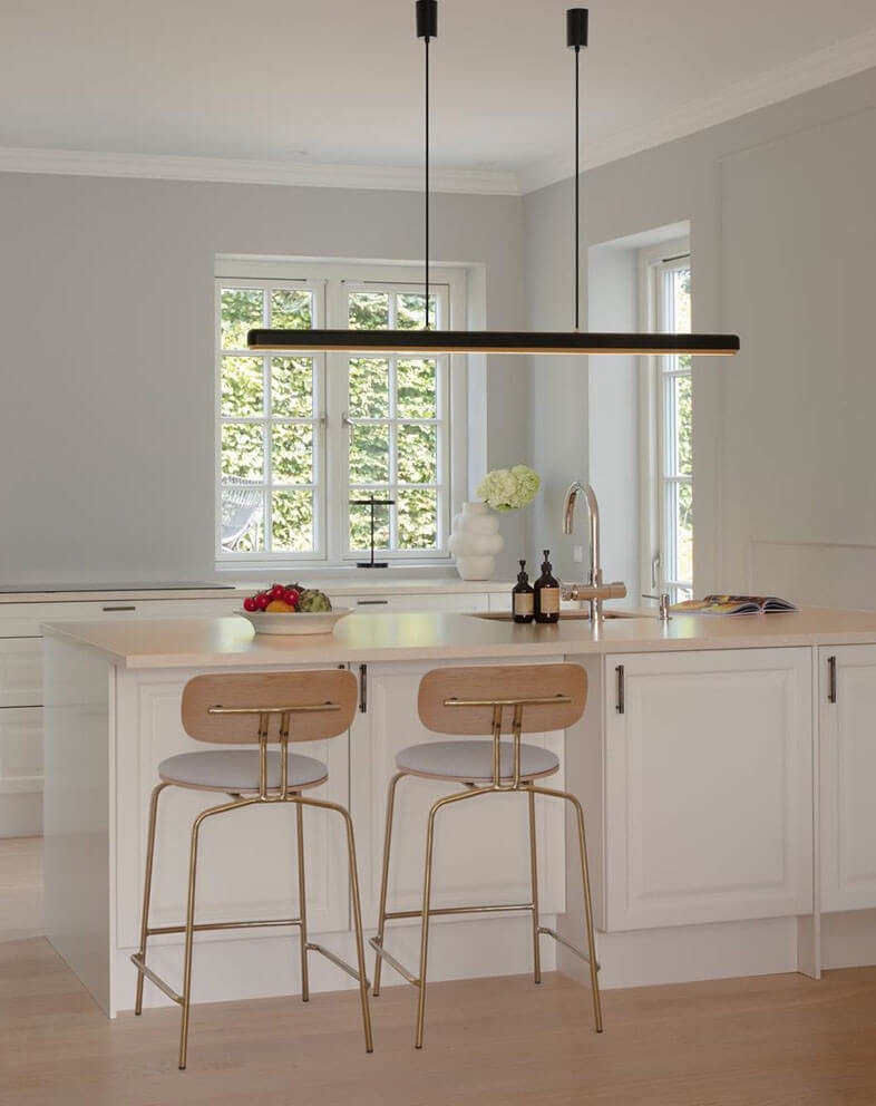 Hazel Branch z jego smukłym designem jest idealny jako oświetlenie nad stołem jadalnym i może być również używany jako lampa kuchenna lub na przykład w sali konferencyjnej. Podłużna lampa jest zarówno funkcjonalna, jak i elegancka z bezodblaskowym źródłem światła LED i umożliwia regulację temperatury barwowej i intensywności światła za pomocą dwóch przycisków na górze klosza.