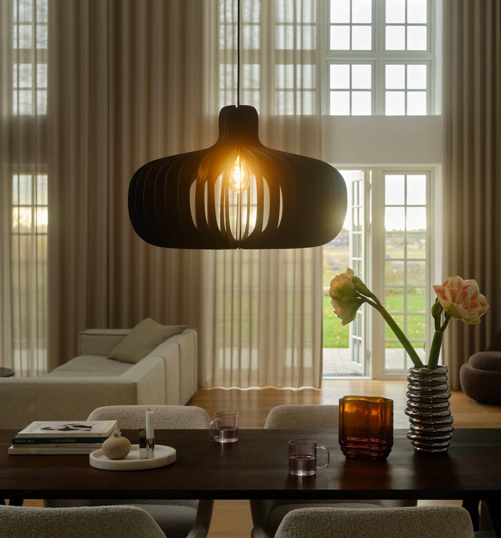 Hazo to lekka lampa wisząca, gdzie organiczne formy wyróżniają się elegancką strukturą z drewna z certyfikatem FSC. Lekki design lampy pozwala na rozpraszanie dekoracyjnego światła w pomieszczeniu, gdzie można doświadczyć gry światła i cienia. Użyj dekoracyjnej żarówki, aby uzyskać inny efekt w lampie.
