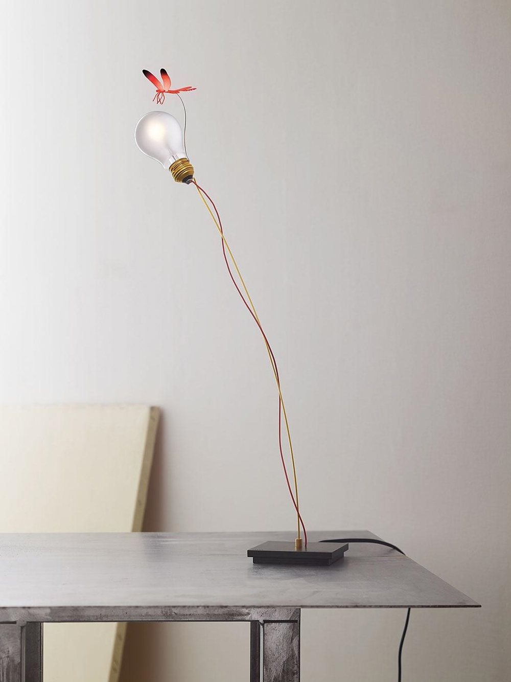 Ingo Maurer I Ricchi Poveri – Bzzzz lampa stołowa składa się z ważki wykonanej z anodowanego aluminium w kolorze niebieskim, stali i mosiądzu oraz żarówki LED.