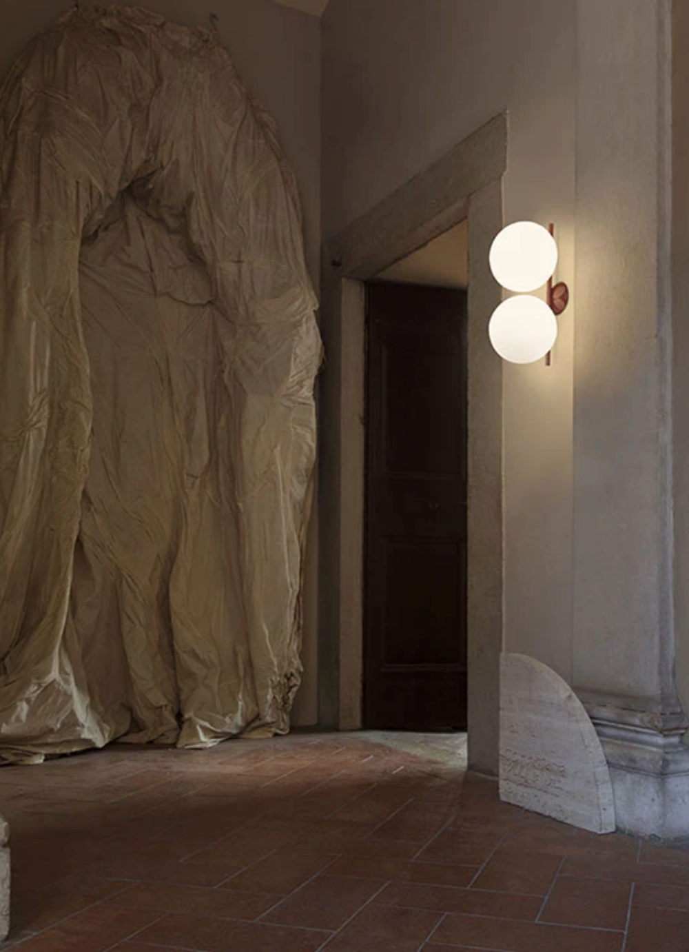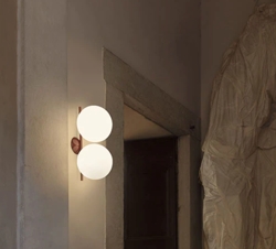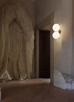 IC Light to seria lamp składająca się z kinkietów, plafonów, lamp podłogowych, stołowych i wiszących, wykonanych z matowego mosiądzu, chromu, matowej czerni i ciemnoczerwieni z białym opalowym szkłem.
