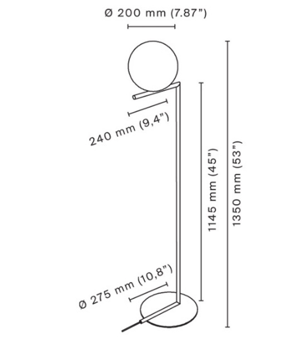 Lampa podłogowa IC Light dostępna jest w dwóch rozmiarach F1 (wysokość 135 cm) oraz F2 (wysokość 185 cm).