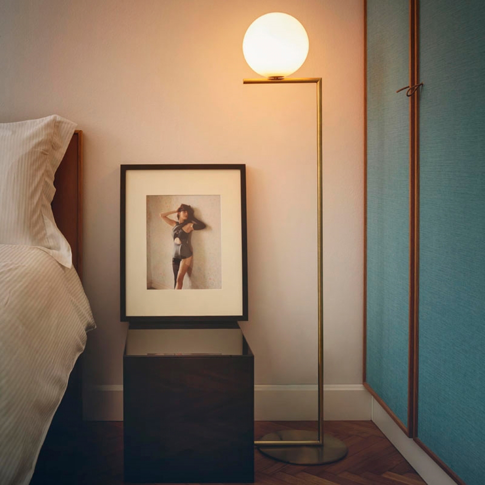 IC Light to seria lamp, która obejmuje kinkiety, lampy sufitowe, lampy podłogowe, lampy stołowe i zwisy, wykonane z matowego mosiądzu, chromu, czerni lub ciemnoczerwonego z białym opalowym szkłem.