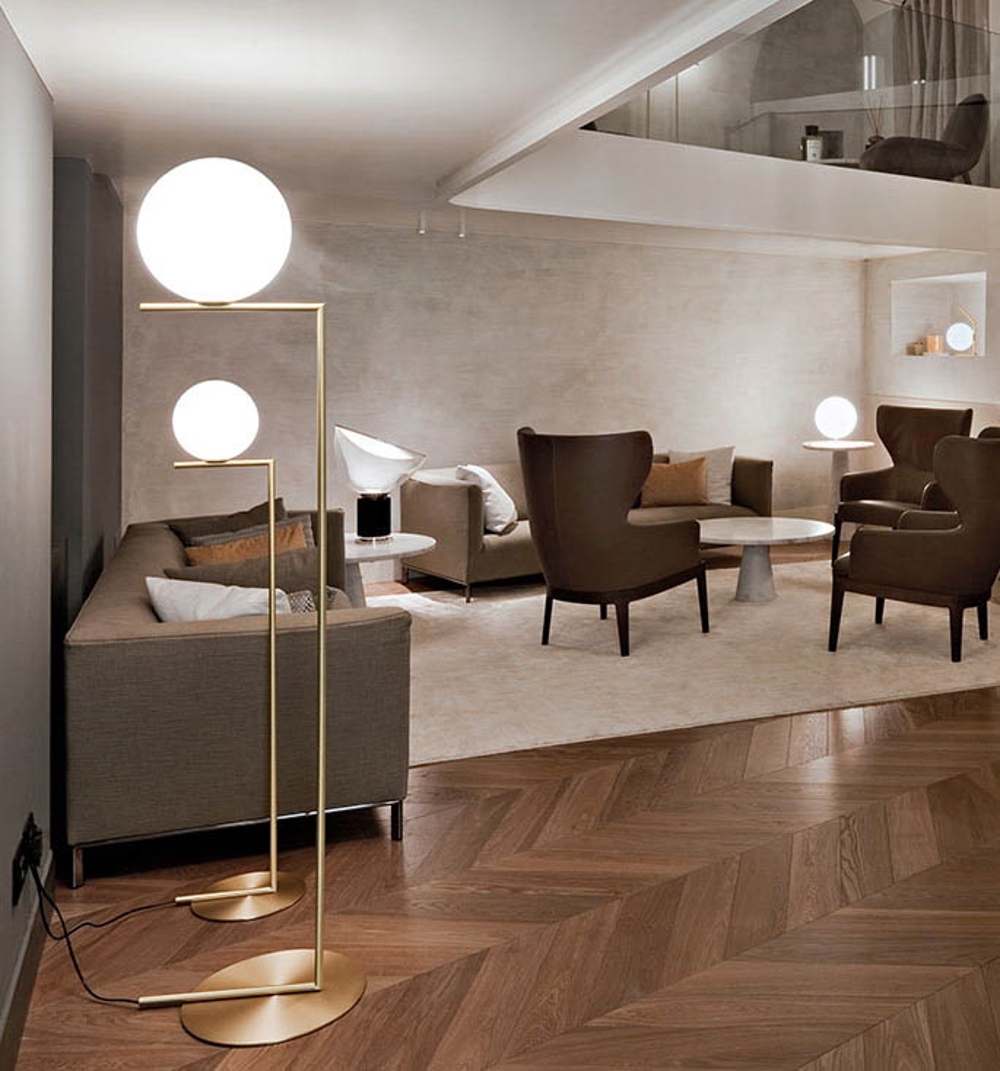 IC Light to seria lamp składająca się z kinkietów, lamp sufitowych, lamp podłogowych, lamp stołowych i zwisów, wykonanych z materiału w kolorze matowego mosiądzu, chromu, czerni lub czerwonego wina z białym opalowym szkłem.