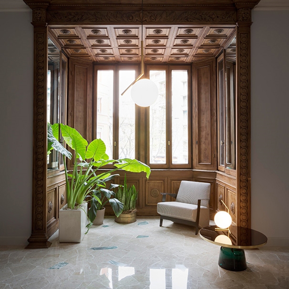 IC Light to seria lamp składająca się z kinkietów, lamp sufitowych, lamp podłogowych, lamp stołowych i pendli, wykonanych z matowego mosiądzu, chromu lub matowej czerni z białym opalowym szkłem.