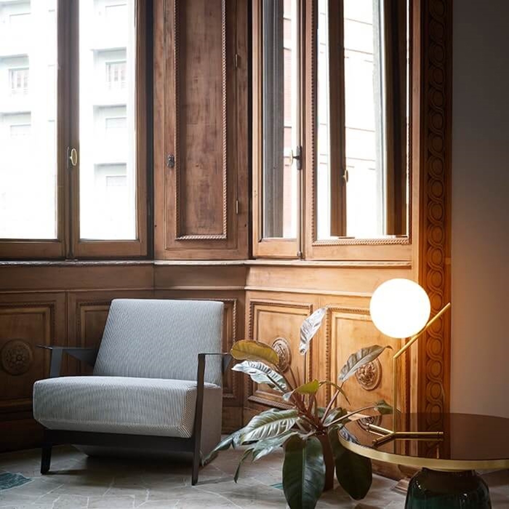 IC Light to seria lamp, która obejmuje kinkiety, lampy sufitowe, lampy podłogowe, lampy stołowe i zwisy, wykonane z matowego mosiądzu, chromu, matowej czerni lub burgundu z białym opalowym szkłem.