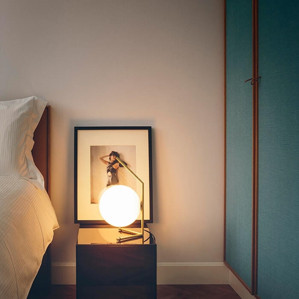 IC Light to seria lamp składająca się z kinkietów, lamp sufitowych, podłogowych, stołowych i wiszących, wykonanych z matowego mosiądzu, chromu, matowej czerni lub czerwieni z białym opalowym szkłem.
