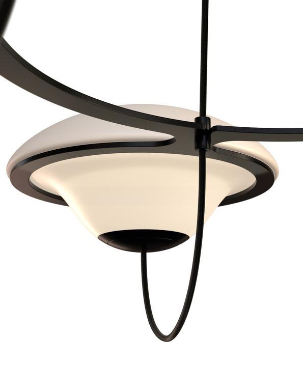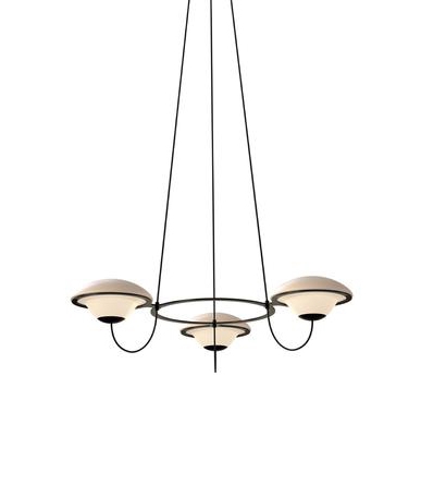 Żyrandol In The Air z 3 kloszami z białego opalowego szkła jest inspirowany nostalgiczną science fiction z futurystycznymi fantazjami o latających spodkach. Klosze przypominające UFO spoczywają na stalowych okręgach czarnej ramy, nadając żyrandolowi lekki i nowoczesny wygląd.