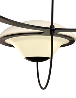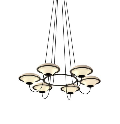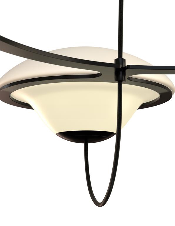 Żyrandol In The Air z 6 kloszami z białego szkła opalowego jest inspirowany nostalgiczną science fiction z futurystycznymi fantazjami o latających spodkach. Klosze przypominające UFO spoczywają na stalowych okręgach czarnej ramy, nadając żyrandolowi lekki i nowoczesny wygląd.
