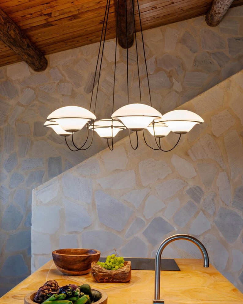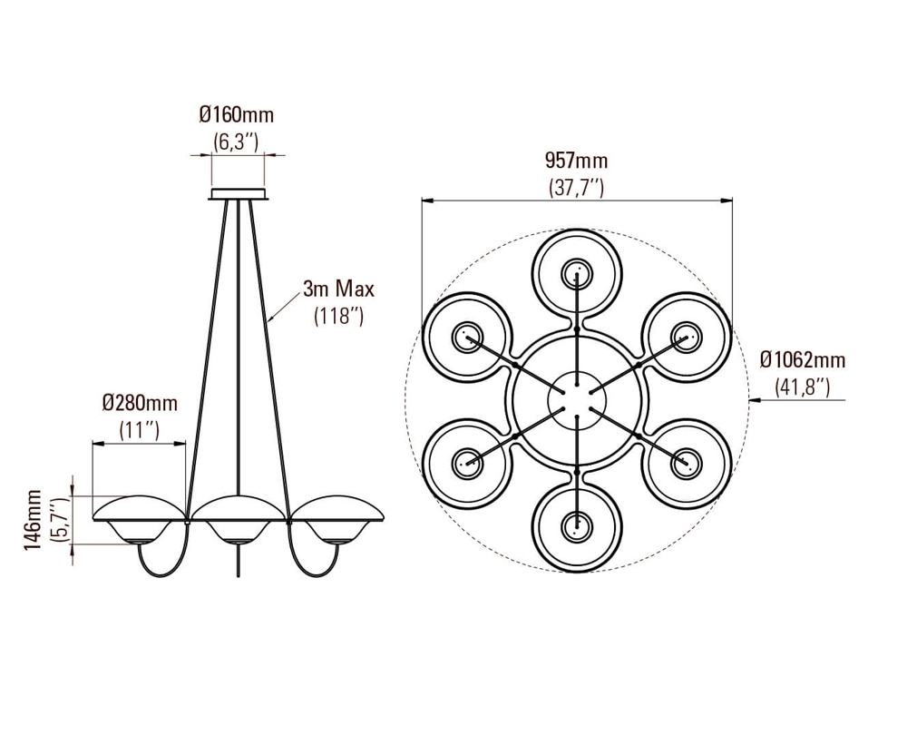 Użyj In The Air jako oświetlenie nad stołem jadalnym lub jako elegancki dodatek do wystroju przedpokoju lub sypialni. Żyrandol dostępny jest z trzema lub sześcioma kloszami.