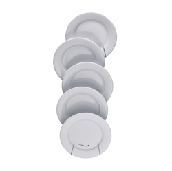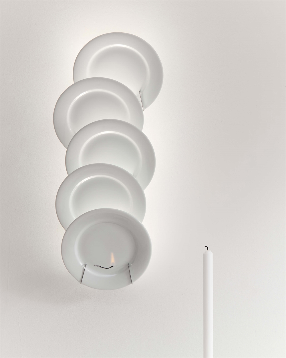 Jasna Kuchnia to poetycki kinkiet, który nadaje nowe życie niektórym codziennym przedmiotom. Prosty stojak na talerze został przekształcony w piękny obiekt świetlny zbudowany z pięciu białych porcelanowych talerzy, które unoszą się w spokojnej kompozycji. Za porcelaną ukryta jest wąska listwa LED, która sprawia, że materiał świeci od wewnątrz, ujawniając subtelne odcienie światła i cienia. Rezultatem jest inny kinkiet o żywym i lekkim wyrazie, który jest idealnym wyborem jako oświetlenie w kuchni lub jadalni.