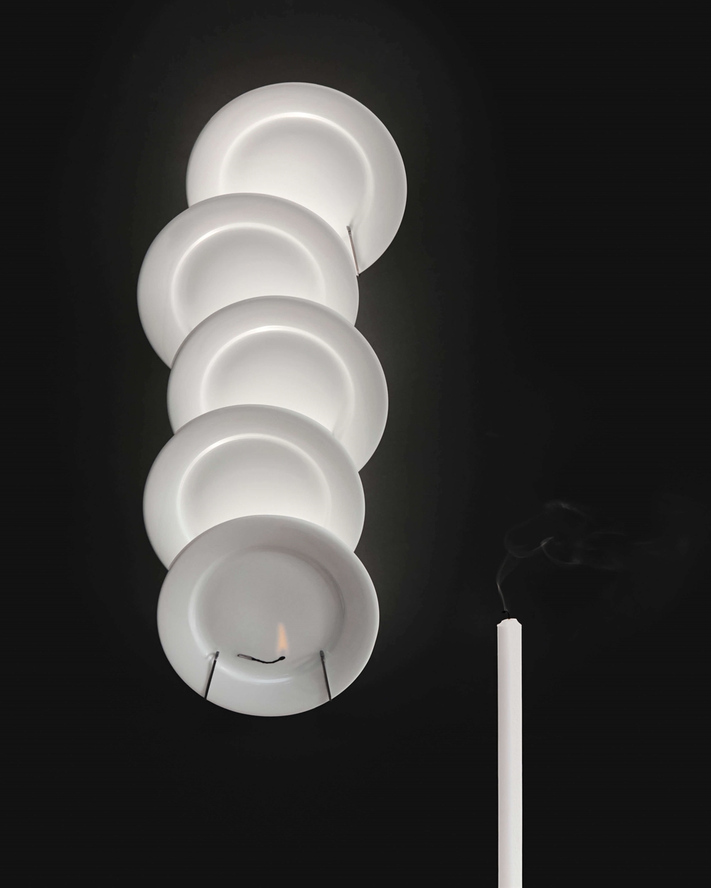 Lampę można dostosować według życzenia, przesuwając talerze nieco na bok, co tworzy bardziej dynamiczny wyraz. Na przednim talerzu znajduje się prosty motyw zapałki. Gdy lampa jest włączona, światło wydaje się zapalać zapałkę w małym wizualnym triku.