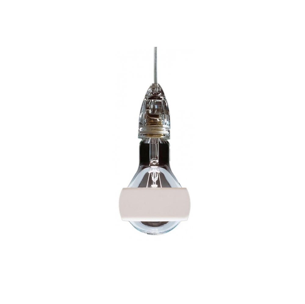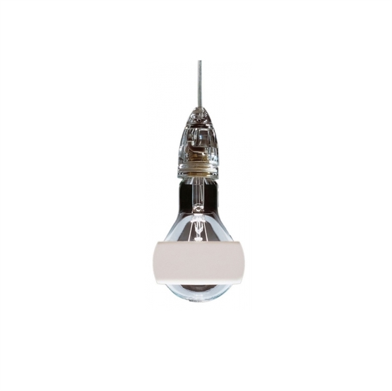 Ingo Maurer Johnny B. Good pendel to regulowana na wysokość lampa wisząca ze specjalną żarówką, Ø10 cm, szklanym gniazdem i białym pierścieniem klosza wykonanym z odpornego na ciepło PTFE, plastiku.