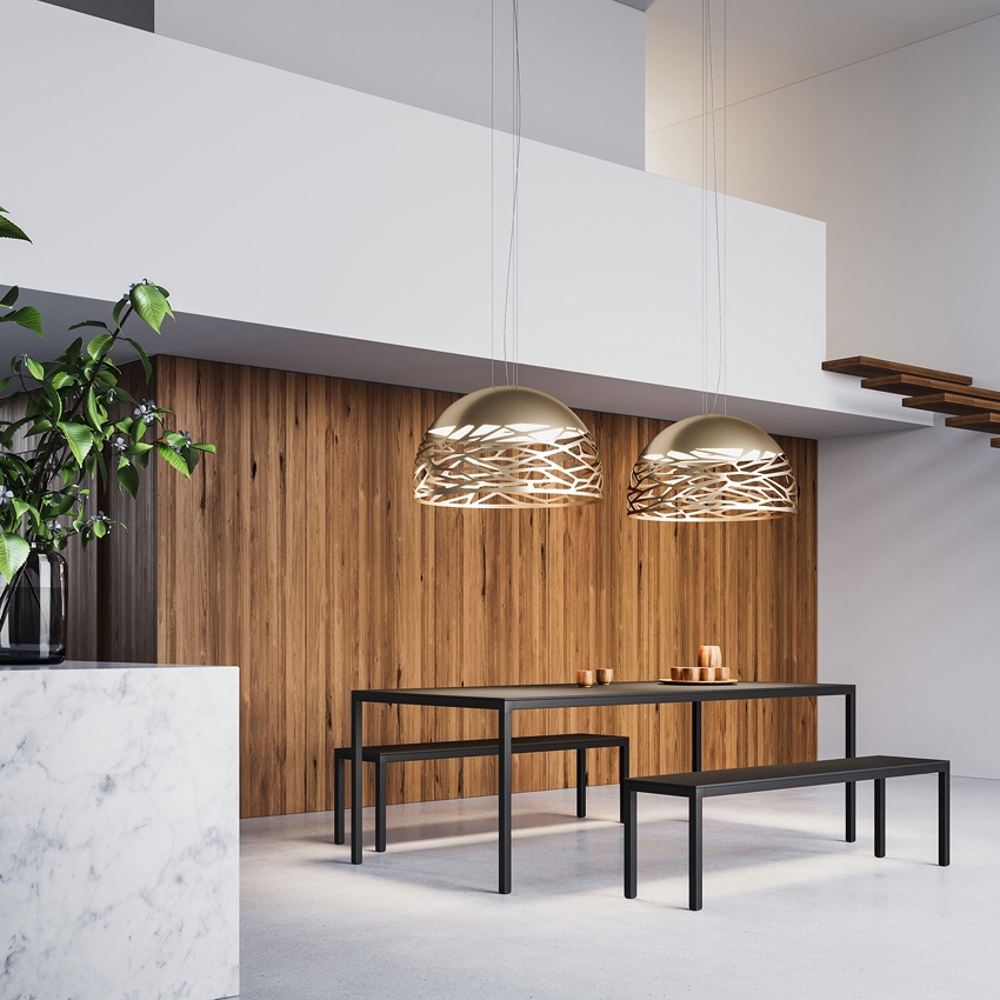 Laserskrojony klosz lampy Kelly Dome pozwala światłu swobodnie przepływać, tworząc piękną grę świateł w pomieszczeniu. Lampa daje przyjemne światło, dlatego idealnie nadaje się do umieszczenia nad stołem jadalnym.