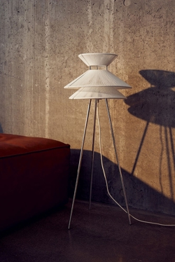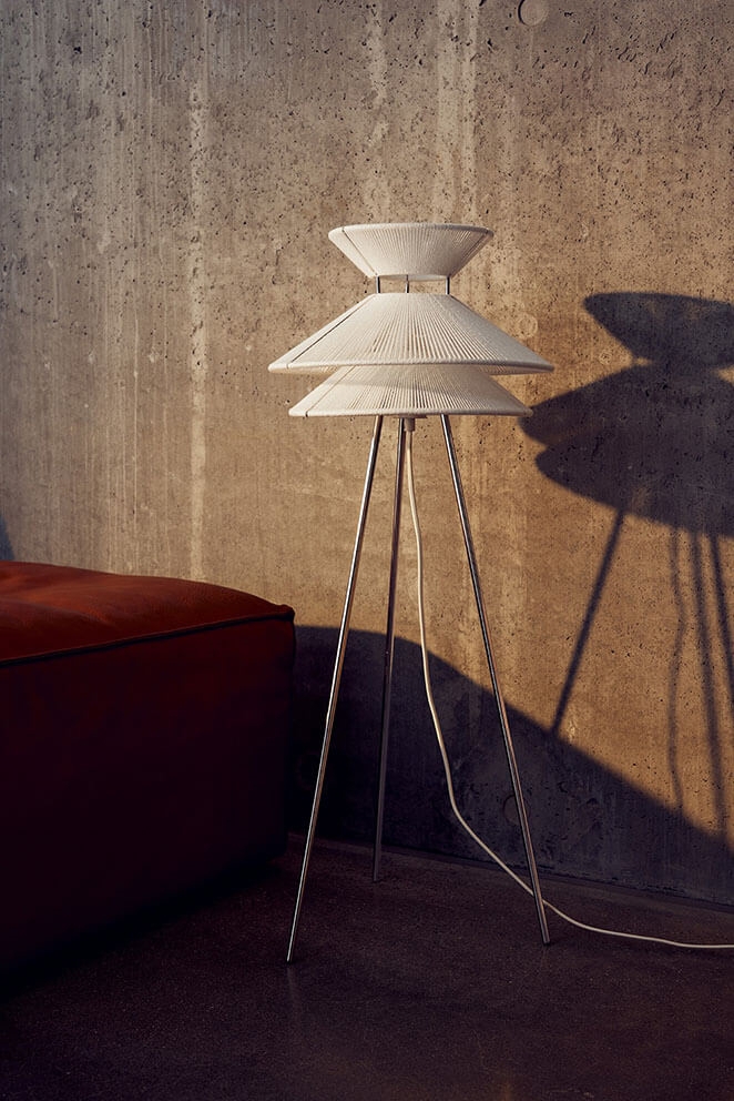 Lampa podłogowa Kiku jest inspirowana tradycyjnymi japońskimi kapeluszami samurajskimi i dzięki prostym liniom nawiązuje również do skandynawskiego designu. Połączenie stali nierdzewnej i lnianych nici tworzy lekkość w projekcie, gdzie nici w kloszu przyczyniają się do stworzenia miękkiego i funkcjonalnego światła oraz pięknego graficznego efektu świetlnego na otoczeniu.