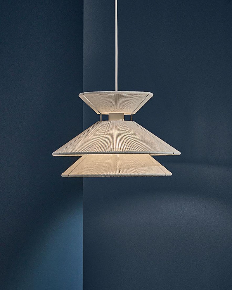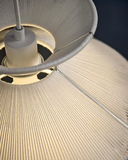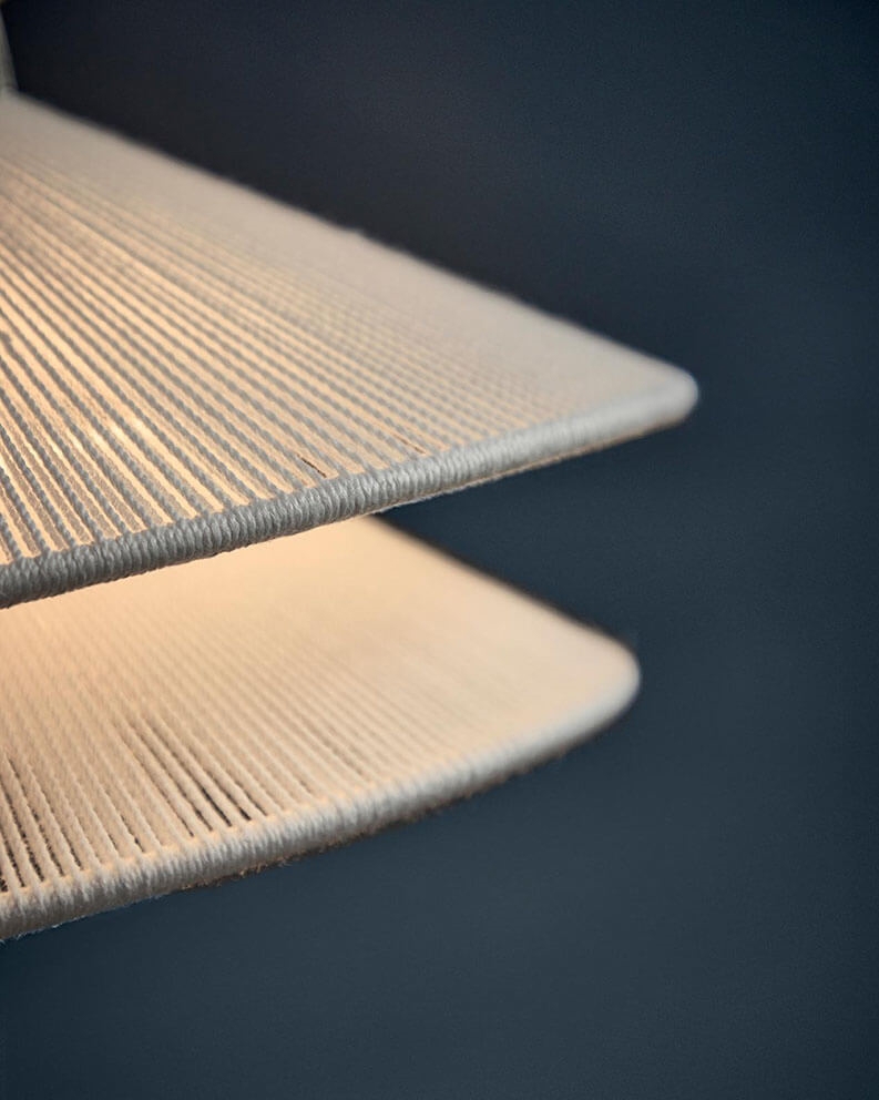 Lampa wisząca Kiku jest inspirowana tradycyjnymi japońskimi kapeluszami samurajskimi i jednocześnie nawiązuje do skandynawskiego designu dzięki prostym liniom. Połączenie stali nierdzewnej i lnianych nici tworzy lekkość w designie, gdzie nici w kloszu przyczyniają się do stworzenia miękkiego i funkcjonalnego światła oraz pięknego graficznego efektu świetlnego na otoczeniu.