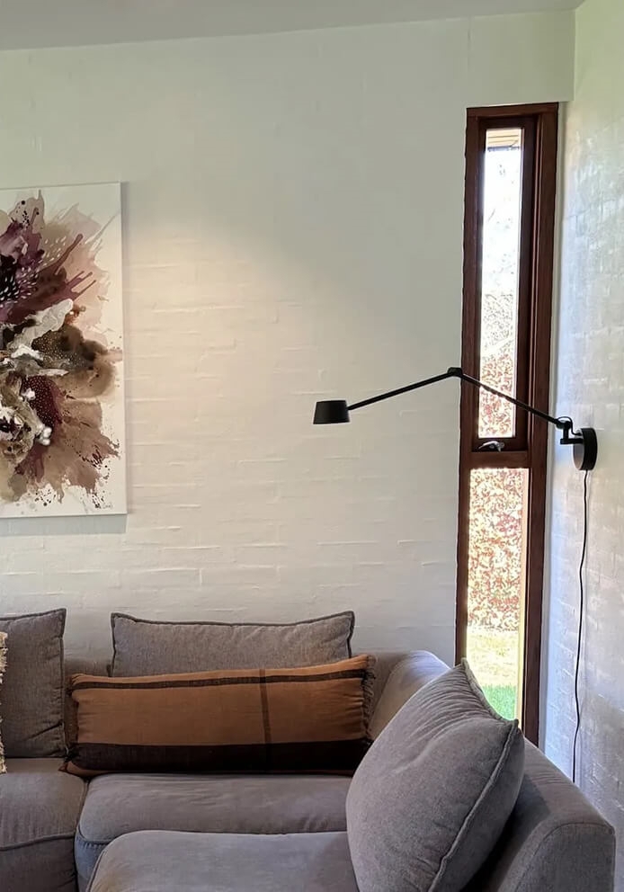 Surowa forma z dyskretnymi i przemyślanymi detalami ma industrialny charakter, podkreślony przez widoczne przeguby i smukłą głowicę lampy.