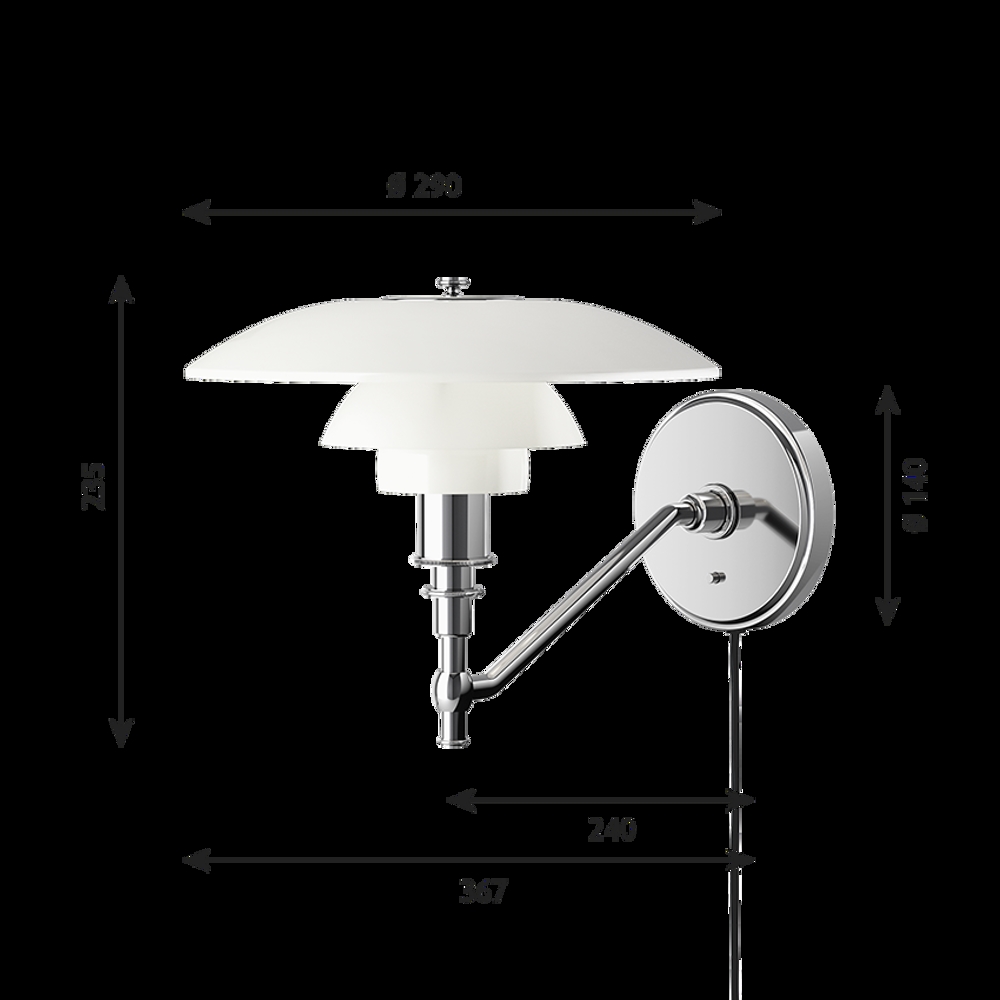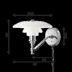 Ten wariant kinkietu PH 3/2 jest z przewodem. Ramię kinkietu wykonano z mosiądzu chromowanego na wysoki połysk, a uchwyt z ciągnionego mosiądzu chromowanego na wysoki połysk.