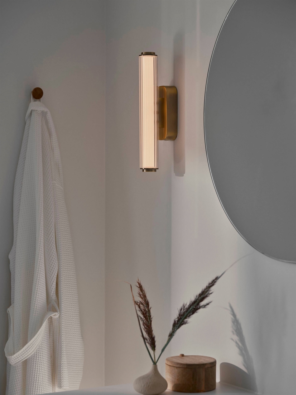 Kinkiet Virelle 32 łączy ponadczasowy design z funkcjonalnym światłem, a dzięki klasie szczelności IP44 doskonale sprawdzi się w łazienkach i większości innych wnętrz. Dekoracyjna lampa ze zintegrowanym źródłem światła LED ma ryflowany klosz, który dodaje pomieszczeniu pięknej faktury. Temperaturę barwową jasnego i przyjemnego światła można podczas instalacji ustawić na białe światło 3000K lub chłodne białe światło 4000K.