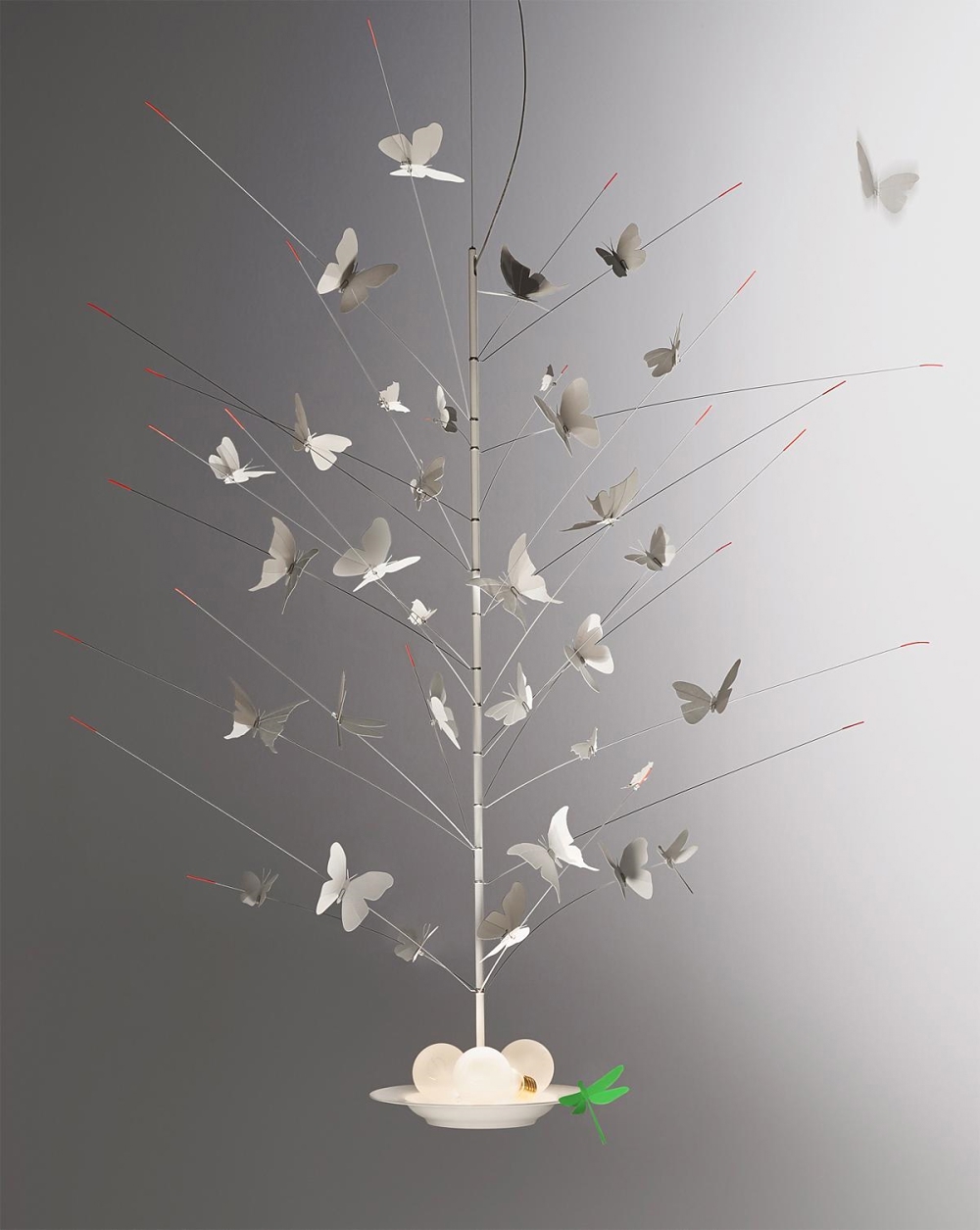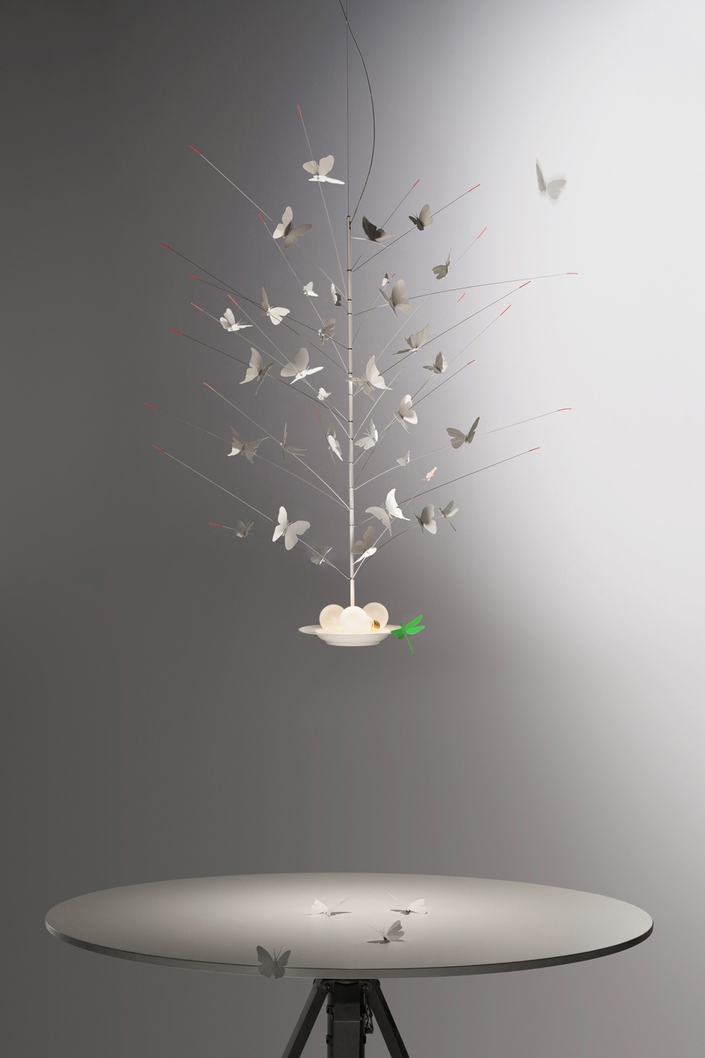 Ingo Maurer La Festa delle Farfalle pendel to fajerwerk składający się z 34 delikatnych motyli i ważki wykonanych z papieru. Trzy źródła światła są umieszczone jako żarówki na porcelanowej płycie. W płycie zintegrowane są diody LED, które zapewniają oświetlenie w górę i w dół.