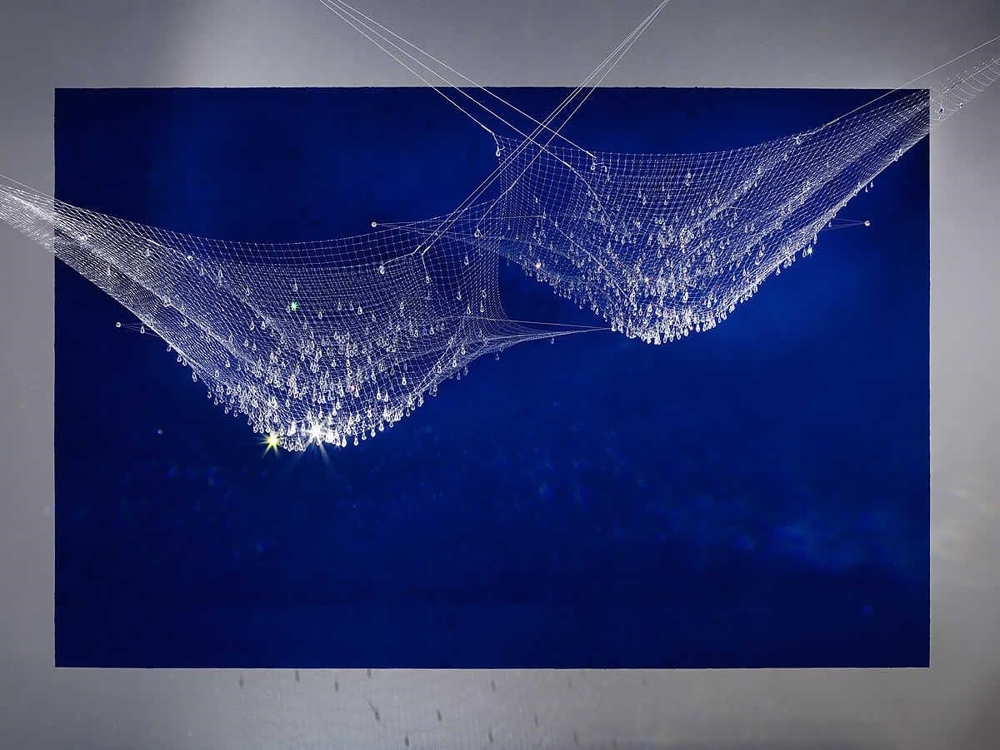 Piękna i imponująca lampa sufitowa / dekoracja Lacrime del Pescatore składa się z warstwowych nylonowych siatek w trzech różnych rozmiarach z 385 kryształami.