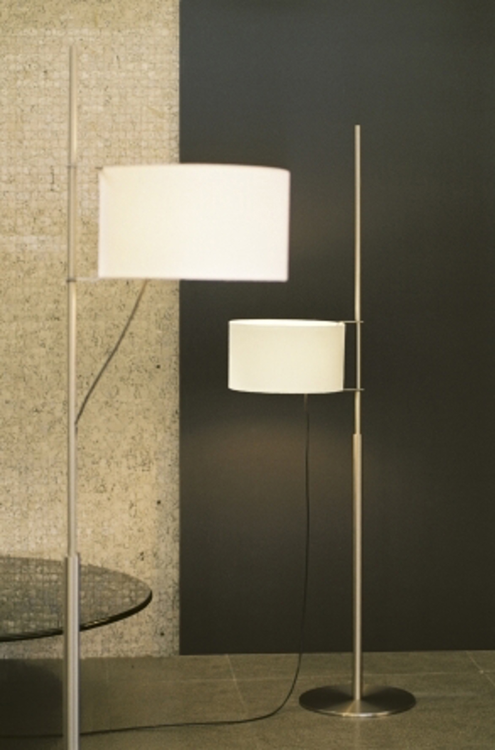 Lampa podłogowa TMD to metalowa wersja bardzo popularnej serii lamp TMM autorstwa Miguela Milá. Największa różnica między tymi dwoma lampami polega na tym, że TMD ma metalowy stelaż zamiast drewnianego - ponadto lampa podłogowa TMD ma również okrągłą podstawę. Stelaż lampy wykonany jest z satynowanego niklu, a klosz, który można regulować na wysokość za pomocą małego gumowego pierścienia na stelażu, jest z białego lnu.