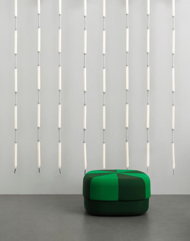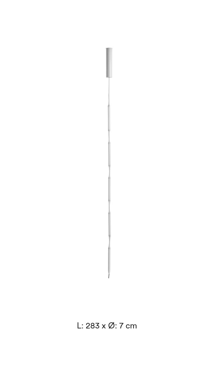 Lampa Reb 5 to nietypowy zwis, składający się z pięciu modułów LED pokrytych białą siatką z PET. Lampa wisi z sufitu jak oświetlona lina i jest elastyczna, dzięki czemu można ją aranżować samodzielnie lub w grupie jako element rzeźbiarski w pomieszczeniu, lub zawiesić obok siebie jako przegroda lub zasłona świetlna.