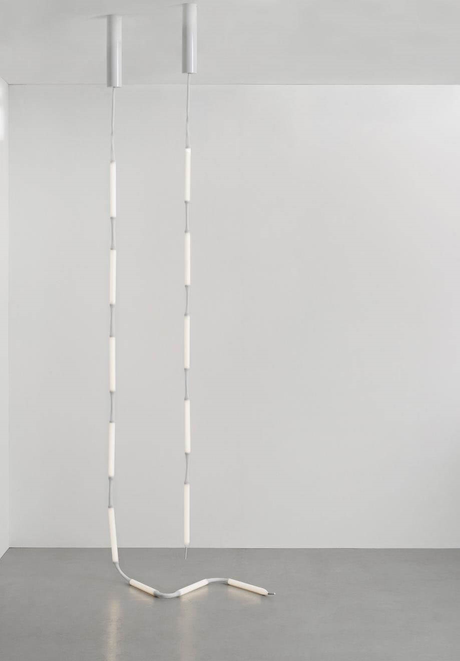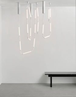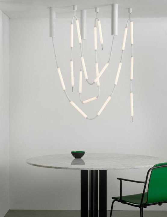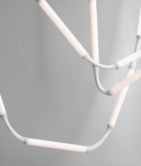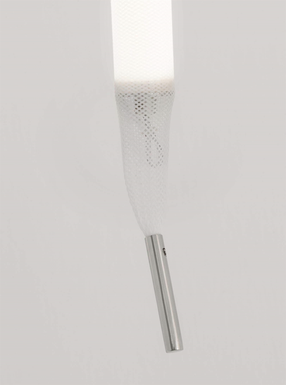 Lampa Reb 8 to nietradycyjna lampa wisząca, składająca się z ośmiu modułów LED pokrytych białą siatką z PET. Lampa wisi z sufitu jak oświetlona lina i jest elastyczna, dzięki czemu można ją aranżować samodzielnie lub w grupie jako element rzeźbiarski w pomieszczeniu, lub zawiesić obok siebie, aby pełniła funkcję przegrody lub kurtyny świetlnej.