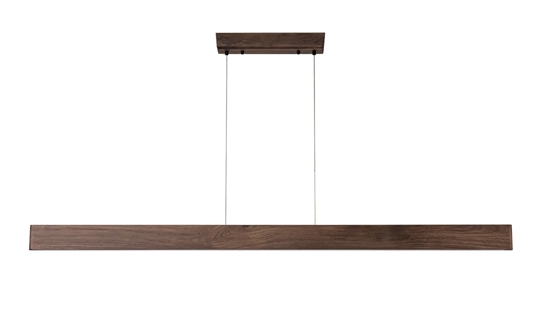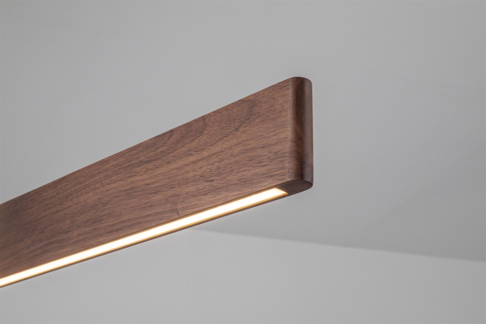 Lampa wisząca jest dostępna w dwóch wykończeniach drewna – orzech o ciepłym, ciemnym blasku lub czarny jesion, który nadaje bardziej nowoczesny wygląd.