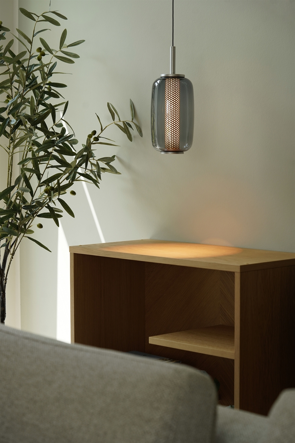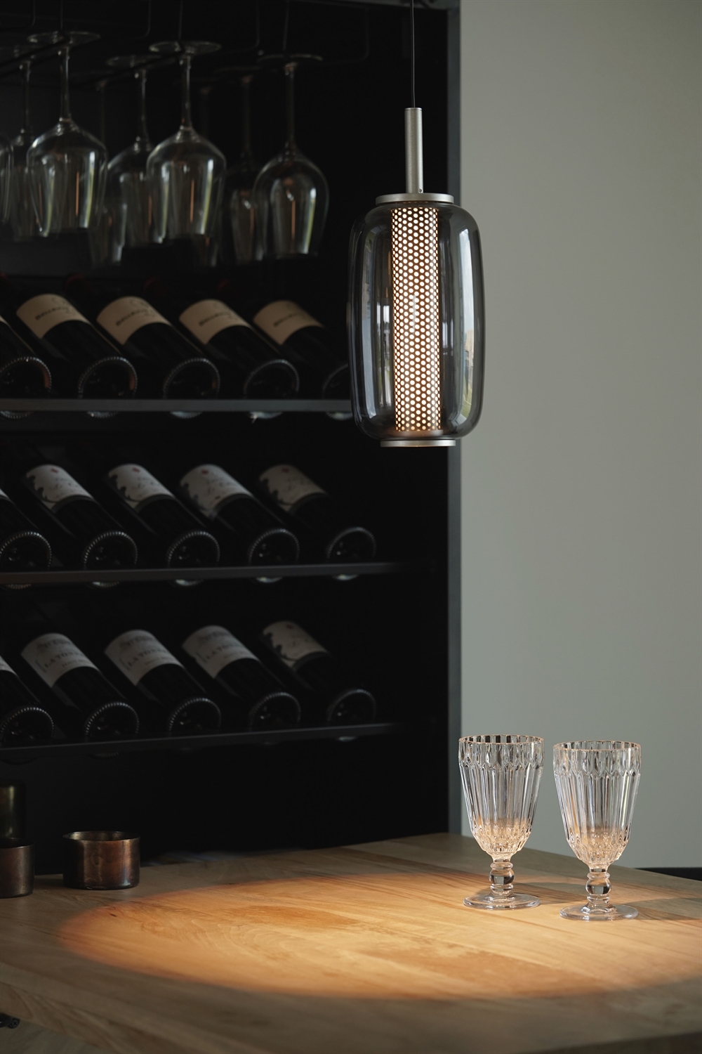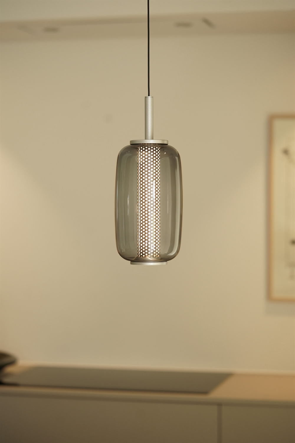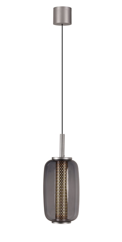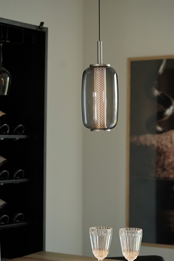 Lampa wisząca została wykonana z przyciemnianego szkła oraz perforowanego wewnętrznego klosza, co tworzy ciekawy kontrast w projekcie. Wewnętrzny klosz pomaga kształtować światło, a zewnętrzny szklany klosz nadaje lampie elegancki i dekoracyjny charakter. To świetny wybór jako oświetlenie nad stołem w jadalni lub wyspą kuchenną oraz jako oświetlenie nastrojowe w wielu aranżacjach.
