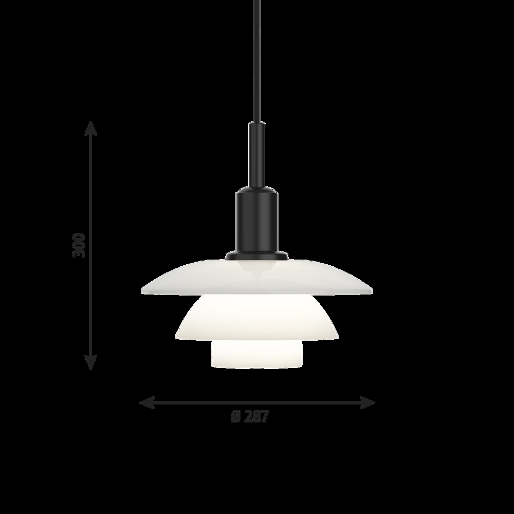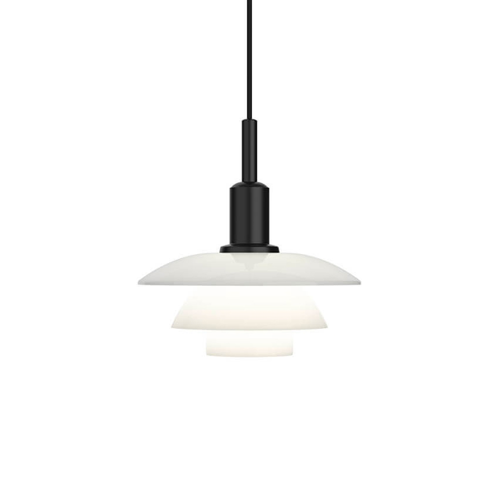 PH 3/3 ma oprawkę z matowej, czarnej, malowanej proszkowo odlewanej cynkowej części oraz klosze z ręcznie dmuchanego białego szkła opalowego. Lampa wisząca PH 3/3 jest dostępna także w wersji z całkowicie matowymi czarnymi metalowymi kloszami lub w wariancie łączącym matowy czarny metalowy klosz i opalowe szklane klosze.
