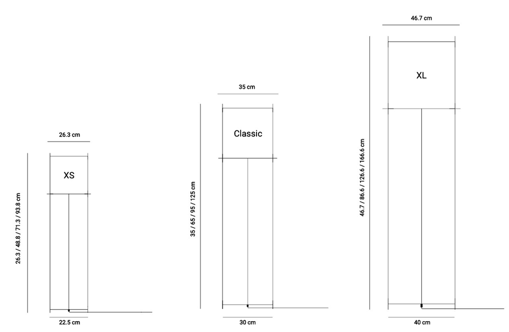 Lotek dostępna jest jako lampa podłogowa w wersjach XS, classic i XL z czarną lub stalową ramą.
