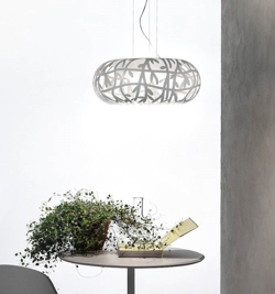 Lampa wisząca Maggio daje piękne światło i nie oślepia. Klosz lampy wiszącej wycinany laserowo pozwala światłu przepływać i tworzyć piękną grę w pomieszczeniu.