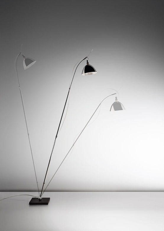 Ingo Maurer Max. Lampa podłogowa wykonana jest z czystego aluminium i stali nierdzewnej. Przegub kulowy umożliwia obracanie i pochylanie lampy w dowolnym kierunku. Reflektor (z uchwytem) można obracać we wszystkich kierunkach. Reflektor z czystego aluminium jest lustrzany lub lakierowany na czarno.
