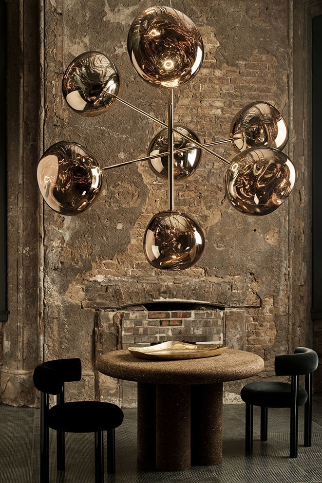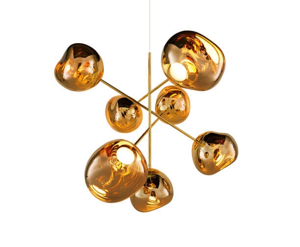 Melt duży żyrandol składa się z siedmiu metalizowanych, niedoskonałych kulistych kloszy z efektem lustra, które są zamontowane tak, że unoszą się od podstawy, tworząc dynamiczną rzeźbę świetlną.