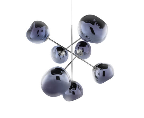 Melt duży żyrandol składa się z siedmiu metalizowanych, niedoskonałych kulistych kloszy z efektem lustra, które są zamontowane tak, że unoszą się od podstawy, tworząc dynamiczną rzeźbę świetlną.