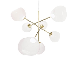 Melt duży żyrandol składa się z siedmiu tonowanych, niedoskonałych kulistych kloszy, które są zamontowane tak, że unoszą się od podstawy, tworząc dynamiczną rzeźbę świetlną.