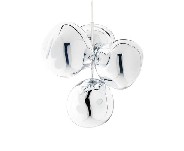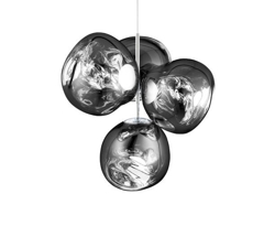Melt mały żyrandol to nowoczesna reinterpretacja żyrandola, składająca się z czterech metalizowanych, niedoskonałych kulistych kloszy z efektem lustra, zamontowanych w małej grupie.
