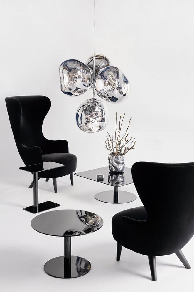 Seria Melt powstała we współpracy między Tom Dixon a szwedzkim kolektywem projektowym Front z pragnieniem stworzenia niedoskonałego, organicznego i naturalistycznego obiektu świetlnego. Wyraz serii inspirowany jest stopionym szkłem, wnętrzem topniejącego lodowca i obrazami głębokiego kosmosu.
