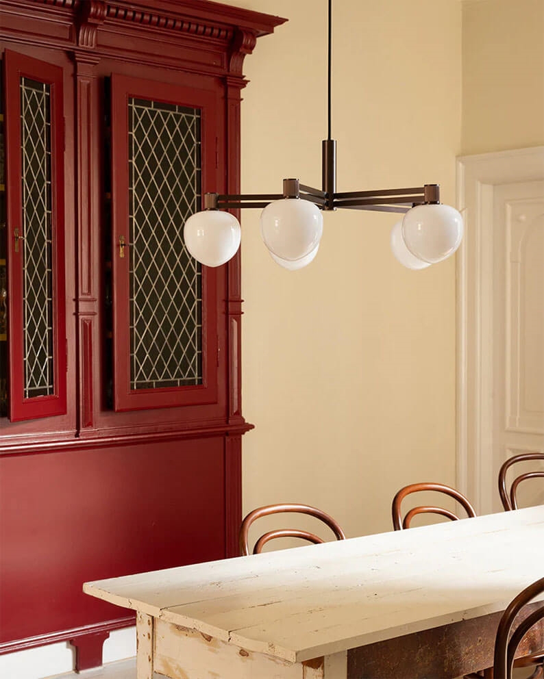 Żyrandol składa się z 3-warstwowego opalowego szkła, które pięknie łączy się z detalami w brązie. Grube opalowe szkło osłania źródło światła, dzięki czemu jest ono bezodblaskowe i jednolite w pomieszczeniu. Żyrandol byłby idealny nad stołem kuchennym lub sofą.